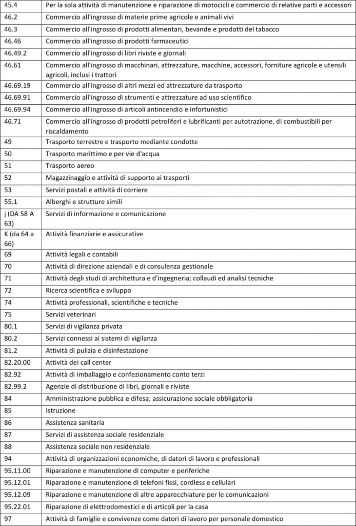 - a) sono sospese tutte le attività produttive industriali e commerciali, ad eccezione di quelle indicate nell’allegato 1 e salvo quanto di seguito disposto. Le attività professionali non sono sospese e restano ferme le previsioni di cui all’articolo 1, punto 7, decreto del Presidente del Consiglio dei ministri 11 marzo 2020. Per le pubbliche amministrazioni resta fermo quanto previsto dall’articolo 87 del decreto-legge 17 marzo 2020 n. 18. Resta fermo, per le attività commerciali, quanto disposto dal decreto del Presidente del Consiglio dei ministri 11 marzo 2020 e dall’ordinanza del Ministro della salute del 20 marzo 2020. L’elenco dei codici di cui all’allegato 1 può essere modificato con decreto del Ministro dello sviluppo economico, sentito il Ministro dell’economia e delle finanze;